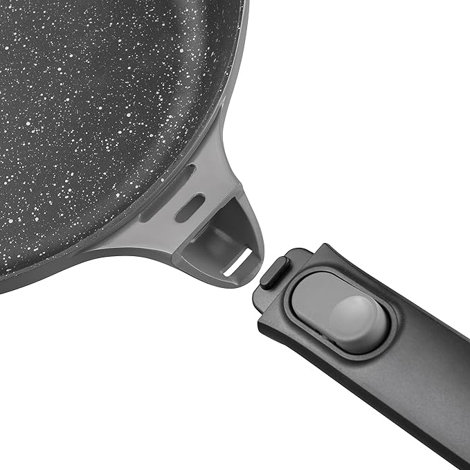 - Frying a big batch of chicken cutlets, a family-sized omelete or a larger portion of veggies is easy as pie in this generously sized frying pan. The pan is suitable for any kind of stovetop, including induction, and is equipped with a multilayered non-stick coating that not only allows you to cook with little to no oil but also makes the pan a breeze to clean. On top of that, the aluminum body guarantees a fast and even heat distribution so you can cook energy-efficiently without any hot spots and enables you to finish your ingredients in the oven provided that you snap off the detachable handle.