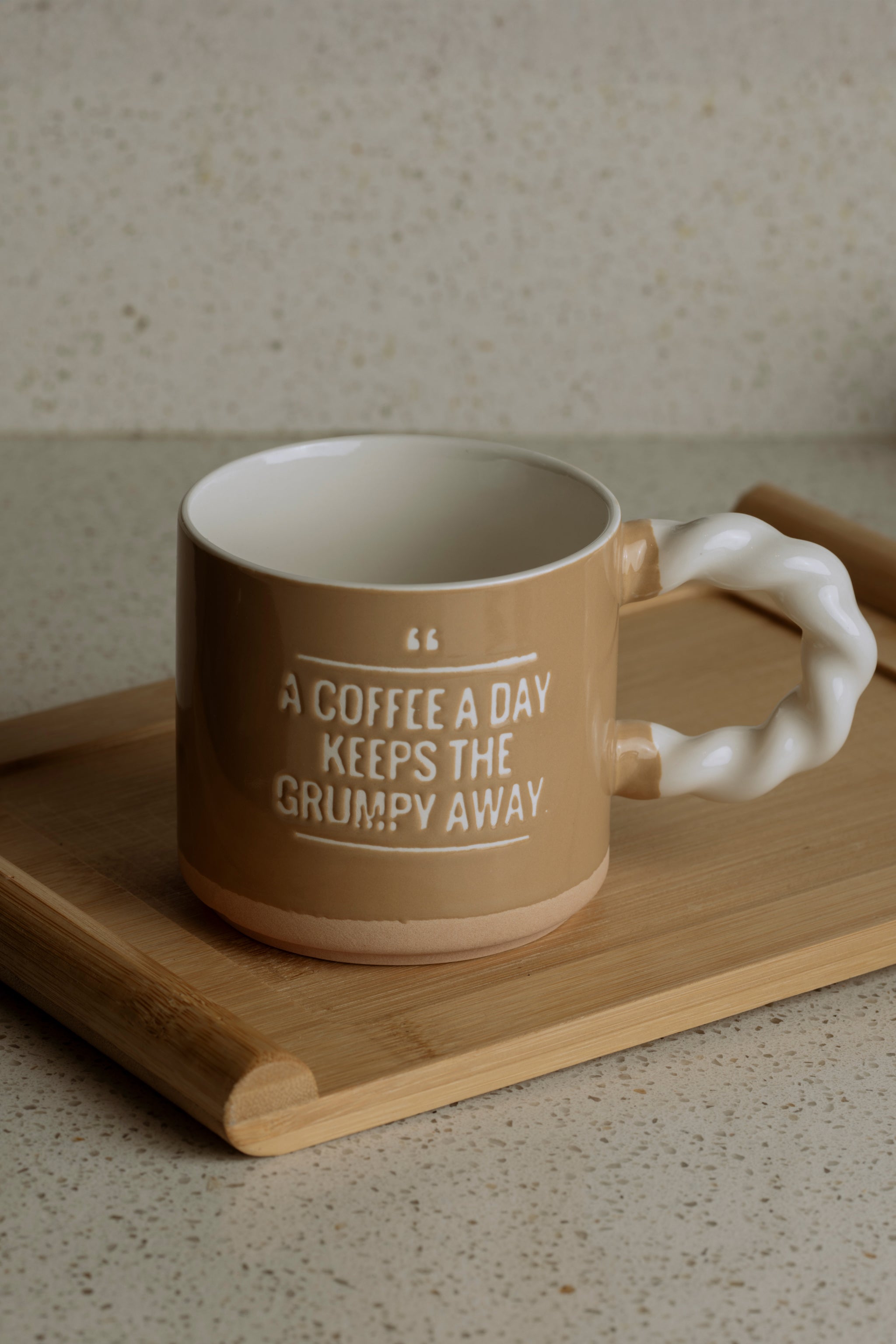 • Start your mornings with a smile and a sip from the Grumpy-Free Twist Handle Coffee Mug.